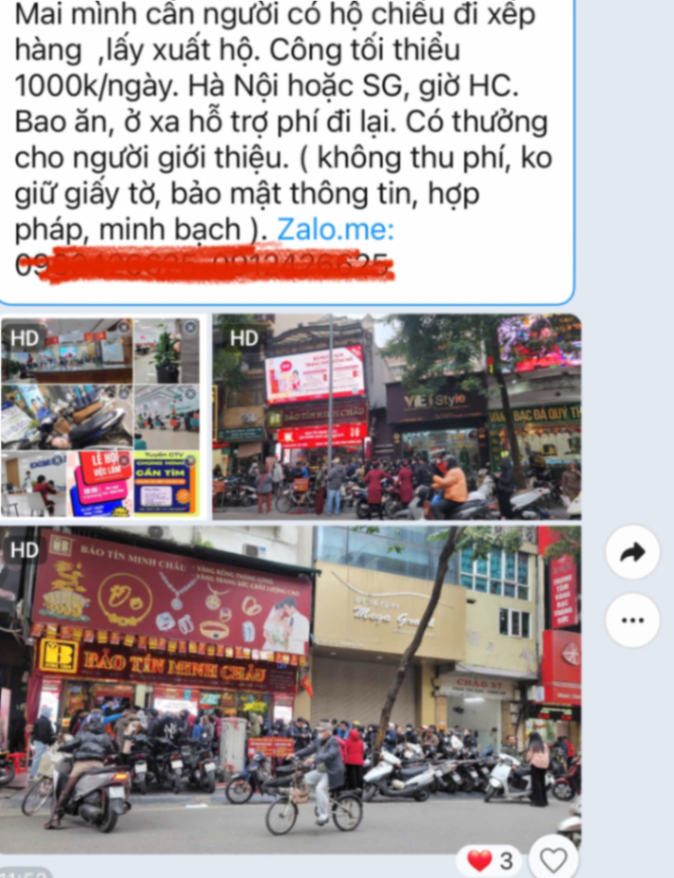 Thay vì trực tiếp bán vàng giả, kẻ gian tạo cớ "khan hàng", "hết slot" tại các cửa hàng lớn. Chúng thuê người dân xếp hàng với mức công hấp dẫn, sau đó tiếp cận những người này để "rủ rê" mua chung với số lượng lớn hơn với giá ưu đãi. Khi nạn nhân chuyển tiền, chúng biến mất hoặc giao kim loại kém chất lượng.