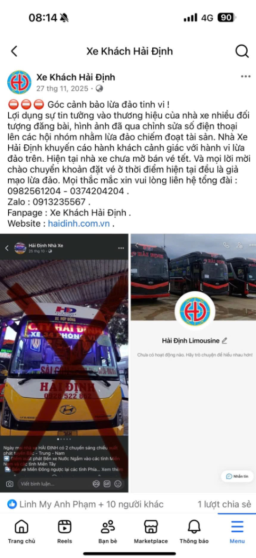 Thời gian gần đây, qua công tác nắm tình hình, lực lượng chức năng phát hiện một số đối tượng xấu lợi dụng uy tín của nhà xe Hải Định để lừa đảo. Bằng thủ đoạn tinh vi, các đối tượng này đã lấy hình ảnh công khai của nhà xe trên mạng xã hội, sau đó sử dụng phần mềm chỉnh sửa ảnh (photoshop) để chèn số điện thoại giả vào các poster, banner quảng cáo.