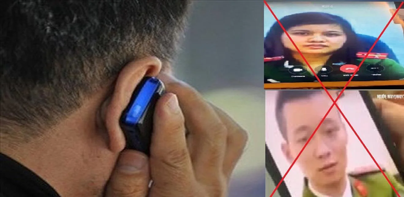 [Ảnh minh họa: Màn hình điện thoại hiển thị cuộc gọi video giả mạo công an].